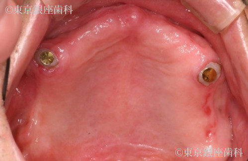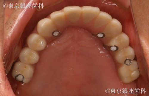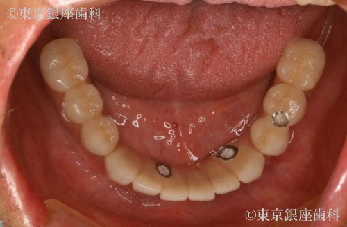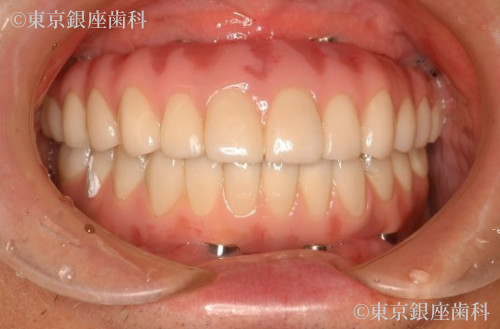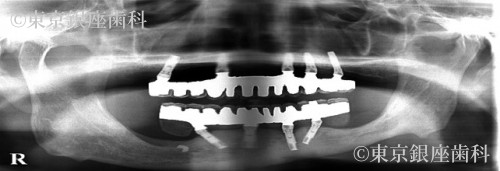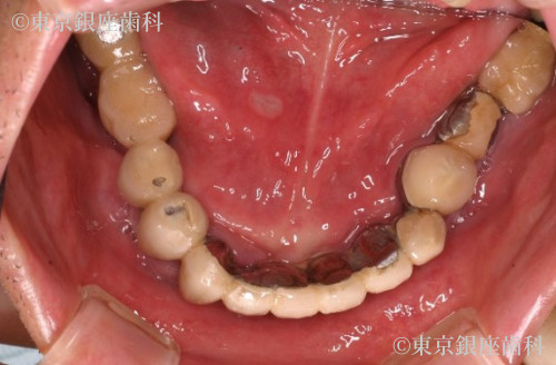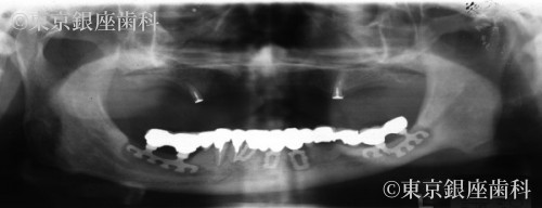 30年前以上に、他院にて下顎に古いタイプのインプラント(ブレードタイプ)での全顎的な口腔機能の回復をしていた。また上顎は入れ歯を装着していた。しかし下顎のブレードタイプインプラントに感染が認められ、インプラントの動揺、周囲の骨に著しい骨吸収が認められ口腔機能の低下が認められた。また下顎管と呼ばれる、下顎の太い血管と神経が入っていいる管の近くまで骨の吸収が進んでいた。咬合に関しても歯の形がすり減り咀嚼が困難な状態となっていた。