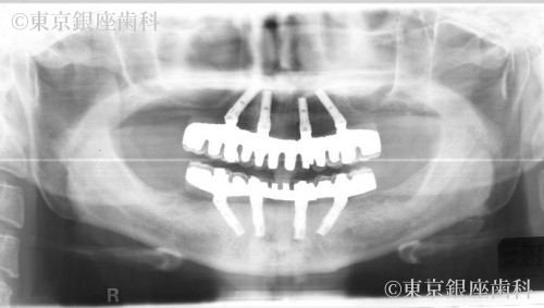 歯周病の進行により歯に動揺があり長期の保存が難しくこのままでは予後が不安であった為全顎的な治療が必要と判断。上下全ての歯を抜歯。重度の歯周病により骨が吸収されているため、上顎骨が薄く左側は上顎洞に骨を足す治療(サイナスリフト)を行い上顎に4本、下顎に4本のインプラントを埋入しワンデイインプラントを行った。現在半年メンテナンス。
