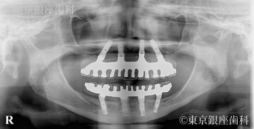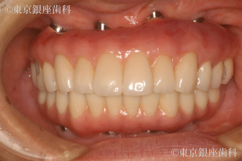 若い頃から入れ歯を使用し噛めない・笑えない悩みを抱えていたが、上下インプラントで噛み合わせと表情が改善。再手術も経て安定している。