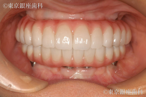 長年歯周病に悩み、不安を抱えて来院。上下インプラントで噛み合わせと見た目が改善。術後調整を経て安定し、現在もメンテナンス継続中。