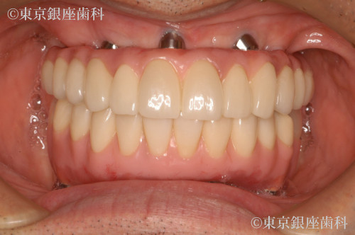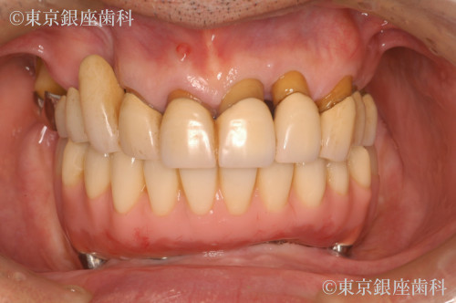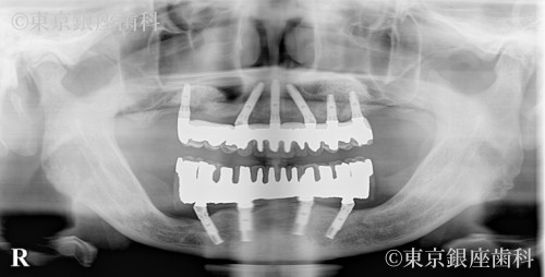 下顎の神経露出に近い難症例。術後一時的に神経麻痺が出たが、理学療法と投薬で半年以上かけて回復。信頼関係の中で上顎治療も希望され、現在は上下とも安定。