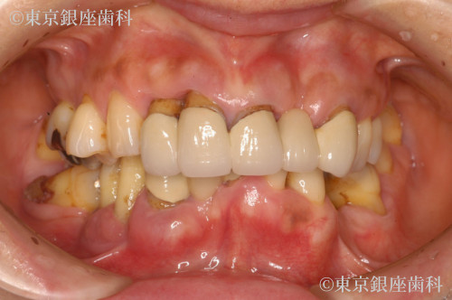 重度歯周病で上下インプラント治療を実施。術後に皮膚の湿疹・赤みが出たが、チタンアレルギーではなく経過観察で改善。現在も問題なく使用できている。