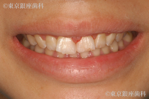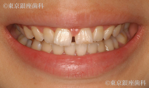歯間空隙(歯と歯の隙間)の一番大きな部分で幅が4㎜程度認められました。上顎左側切歯切縁部(左上の前歯の先端)がかけているのと、古いコンポジットレジンが詰めてあり変色していました。治療前の口腔内の見た目の印象は3㎜の歯間空隙が黒く見え、顔貌が少し緩んだイメージに見えました。