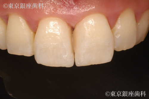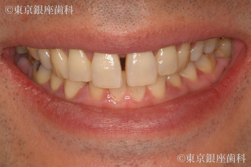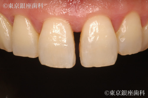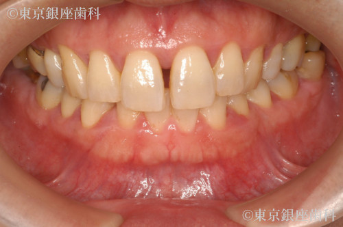 歯間空隙(歯と歯の隙間)が直線的で均一な幅(約2㎜程度)が認められました。顔貌は歯間離開によって少し緩んだイメージに見えました。