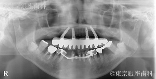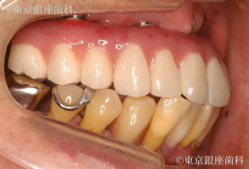 2型糖尿病の治療を経て歯周病の進行によって失われた咬合機能をワンデイインプラントにより回復。ただし費用の都合により上顎のみ手術。患者の希望により残存歯の多い下顎は義歯を使用した例。