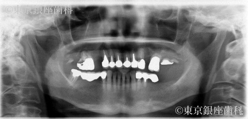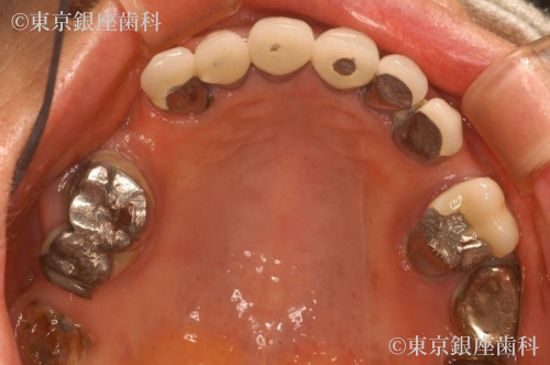 また、奥歯で物を噛めないため前歯で咀嚼を長期にわたり行うことで、前歯への力の負担が強くなり歯の根がヒビが入ったり、折れてしまっている状態でした。