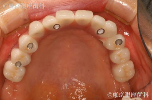 上顎に関しては上記の理由により最小本数のインプラントを支台とした全顎的な人口歯によって口腔機能の回復を予定しました。