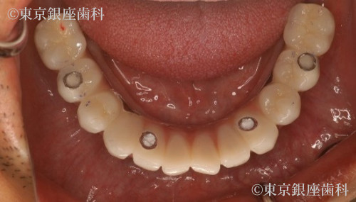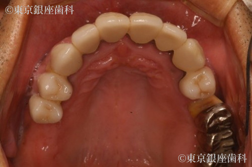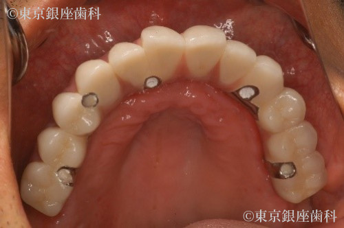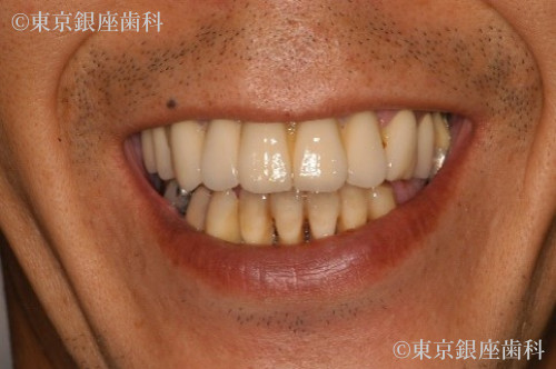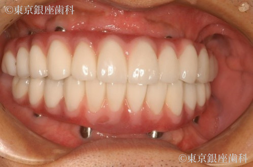 重度の歯周病により骨が吸収されているため、上顎骨が薄く右側は上顎洞に骨を足す治療(サイナスリフト)を行い上顎に5本、下顎に4本のインプラントを埋入しワンデイインプラントを行った。