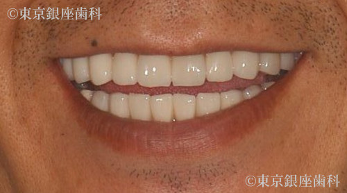 抜歯即時埋入でインプラント治療を行い、その日のうちに仮歯を入れて短期間での大幅な審美、機能の回復をした。